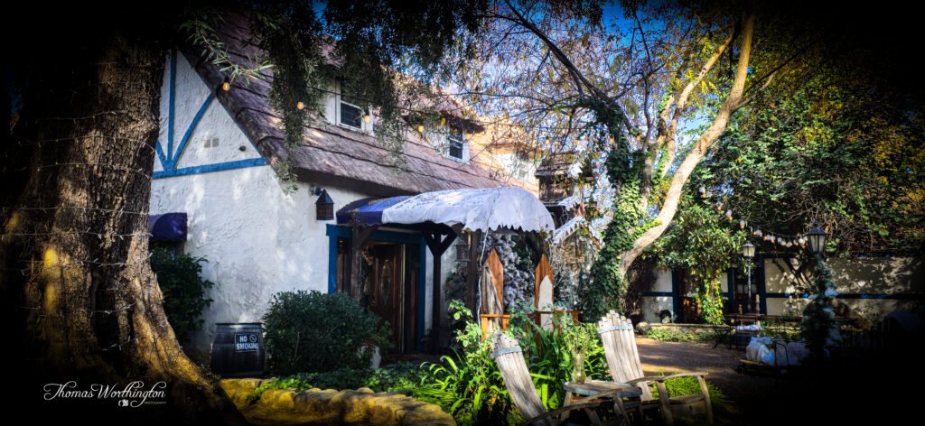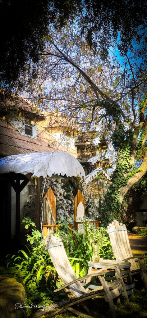 The most striking thing about Briar Rose is the architecture. The main tasting room is housed in a life-size replica of Snow White’s Cottage. The property was originally built in the 1970s by Beldon Fields, a Disney Imagineer who worked on the original Fantasyland and Toon Town at Disneyland. He built the cottage for his wife, handcrafted with the same whimsical, “curved” lines and thatched-roof style seen in the parks. Current owners Les and Dorian Linkogle have preserved every detail—you can even find “hidden” details in the plaster and gnomes tucked away in the gardens.